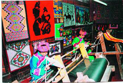 土家织锦又名“西蘭卡普”。所谓“西兰”就是被面;所谓“卡普”,就是花,两句连接起来,就是一种“带花的被面”。这种传统的工艺品,过去都是自产自用,即土家人自种棉花自纺纱,自己织布自绣花,在全国鲜为人知,更不用说扬名世界了。从50年代到80年代初,它才慢慢走出湘西,走向中国和世界。武陵源出产的土家织,成了大批游人的抢手货,并有一部分为港、澳、台同胞和外宾买去珍藏。土家织锦的艺术特色,主要是重表现,重创造妙在神似,它色彩鲜明,跳跃,对比强烈,线条对称,产品经久耐用,是游人使用与欣赏两便的手工艺珍品。土家人的婚姻嫁娶、定情、戀愛、饋贈友人、家庭裝飾、服飾,都離不開織錦。因其工藝獨特,織錦産品曾被列爲貢品。本市各民族工藝廠生産的民族織錦包、織錦袋、風光壁掛及各種織錦工藝品,集山水風光與民族風情於一體,是遊客最佳紀念物.