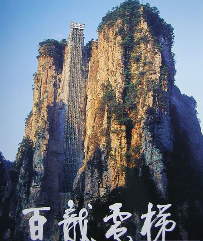 百龙天梯位于世界自然遗产张家界武陵源风景区。工程分布在4.5公里、垂直高差385米的核心景区。电梯运行高度326米,主体由154米山体内竖井和172米贴山钢结构井架等组成,采用三台双层全暴露观光电梯并列分体运行。是连通森林公园、金鞭溪、水绕四门到袁家界、乌龙寨、天子山的重要观光交通设施。百龙天梯工程宏伟,工艺复杂,施工惊险,堪称“世界工程奇观”,它的建成创造了三项基尼斯世界纪录。