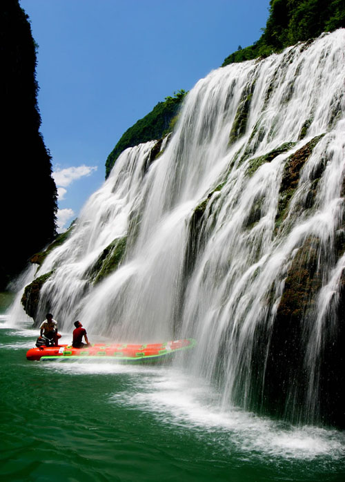 水洞子瀑布而鬼门关的急浪更带着几分野气,它是整条漂流线中最大落差的一个,同时也是最富有刺激的一段,和游人游性的情绪高涨的时刻,在有惊无险的情况之下,载着满船的浪花闯过去。闯过鬼门关我们就可以观水洞子瀑布了,水洞子瀑布是地下水丛石壁上一个大溶洞中流出,高约70米,宽约45米,它妙在既不循岸而落,也非一泻而注而是先顺崖隙而出,时开时合,好似碎玉遍山,又如摧冰下滑。从悬崖上跌落下泻,乘船近瀑布,又觉水从天降,那跌冲崖台的如练垂琼座,直落碧潭的似玉结帷帘,飘浮船中的若裙带轻逸,水洞子瀑布既有高山流水之雅,又有飞泻直落之雄,过水洞子瀑布到绕澜滩头,这绕澜子的名字,是因为石岸的神蛙石到南岩一带的悬崖,很像秦皇所建的长城吧。在长城的下面围绕着一条琼练的玉带,故称绕澜,但绕澜的浪涛也有着不同别的滩,滩下的浅潭,清澈迷人,峭壁屏立,引人叹奇,经阴阳潭、黄土角等大小五道滩,便来到阻舟河,两岸青峰陈列,使人联想到小三峡的景色,而且三峡之处,就是满山的翠叶随着季节的变迁,时而绿如菌,时而红似火。靠右岸峰顶有一组造型别致的岩石,他们如笔如柱,如猴如僧,很像是“西游记”中的唐三藏他们师徒四人正向西天出发呢!