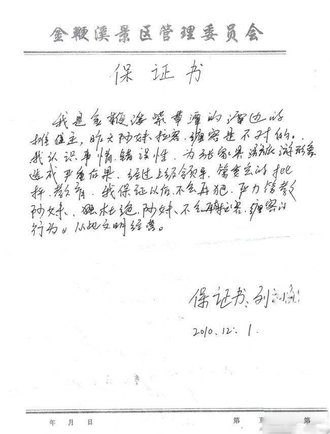 12月1日,梁市长做出批示的第二天,金鞭溪景区管理委员会便找到该摊点摊主,对其提出严厉批评,并要求作出书面保证。摊主刘某此时深刻意识到,由于对自己店内阿妹拉客、缠客的行为管理不严,给游客留下了极差的印象,严重破坏了张家界旅游形象。他保证以后一定文明经营,杜绝此类事件再次发生。