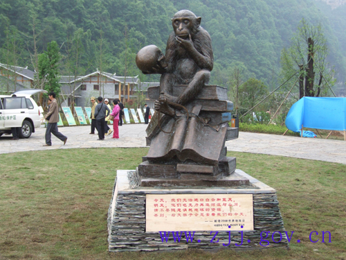 “后天”雕塑,实景为一只坐在达尔文《物种起源》的书上拿着人类的头盖骨在沉思的猴子,立于黄龙洞生态广场入口处,由中国著名雕塑家雷宜锌(黑人民权领袖马丁.路德.金的雕像作者)制作,由叶文智命名并配文,旨在呼唤全人类都来关注、重视、保护赖以生存发展的地球。