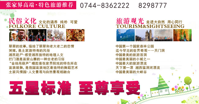 如果您是选择张家界高端自助旅游,充分自主安排自己的旅游行程,减少参团旅游过程中的固定行程带来的烦恼和不便!同时也可以根据天气情况,取舍张家界景点!让张家界之旅在休闲和愉悦中完成,我们给您推荐:2011年张家界高端+特色旅游推荐,是您最佳的选择!