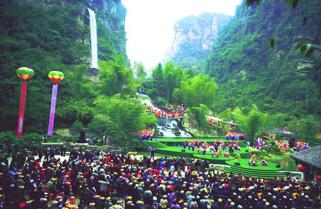 (湖中对歌)请大家注意听,这是土家阿哥阿妹在对歌。土家人能歌善舞,凡土家寨必是山歌之乡。土民上山劳动、打猎、赶集或红白喜事,都要对山歌。特别是一些男女青年谈恋爱,不请红娘大媒,就以情歌牵线。通过对歌,试探对方的文化、口才、人品及表达各自的心思。山歌是诗的艺术,又是音乐韵律艺术,结构上讲究“比”、“兴”,要押韵;一般是对唱,也有即兴而唱的,如:砍柴莫砍桐子柴,桐子打油划得来。