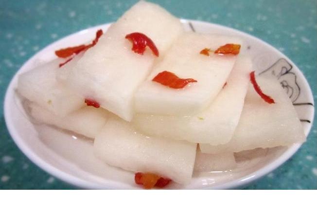 3、将萝卜片用容器装好,撒上白糖、白醋、食盐,加盖腌制;