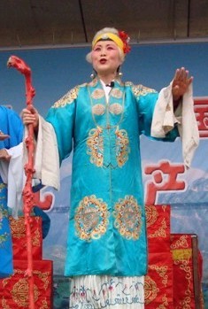 在飞坠浮沉的阳戏表演舞台上,老旦是扮演老年妇女的角色,老旦的表演特点,就是唱、念都用本嗓,用真嗓,但不能像老生那样平、直、刚劲,而像青衣那样婉转迂回。