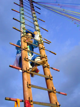 上刀梯是苗族人民的传统风俗,每当赶年场或重大节日如“四月八”、“赶秋节”等,都有勇士表演上刀梯。刀梯器材是一根高10m以上的木杆,杆上凿开36节孔眼,安插上36把钢刀,钢刀长45cm,刀背厚0.5~1cm,刀刃锋利。刀口向上,装成刀梯,安装时加间固紧,以防摇动。33cm一梯,共36梯。桩杆四周拉线固紧,刀梯上端缠系多种颜色的彩布小旗,象征着希望和胜利。上刀梯者,必有胆识、技巧和武功,从第一级往上爬,刀子一把比一把锋利,爬至梯顶,头发往刀上一搁,即断成两截。登梯者还要在刀梯上表演倒挂金钩、大鹏展翅、观音坐莲、古树盘根等节目,施展全身本领。上刀梯是惊心动魄的表演,是英雄所为,是一种奋争,一种自我牺牲,是苗族人民过去生活的显现。刀梯上有血、有汗,也有美和甜。