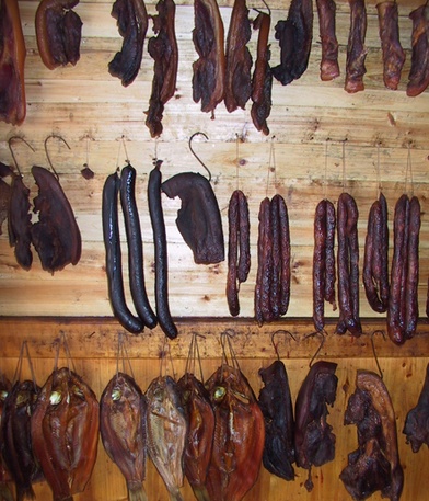 冬腊月间置备年货:腊肉、腊鱼、香肠、血豆腐、炒米、打糍粑、花生、瓜子、水果、包谷籽、奄罗卜、番薯片、烟花炮竹、对联、新衣服等,多数为自家制作的。