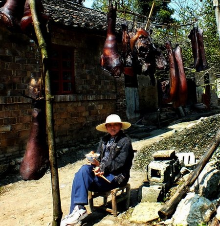 头顶腊肉手端碗;