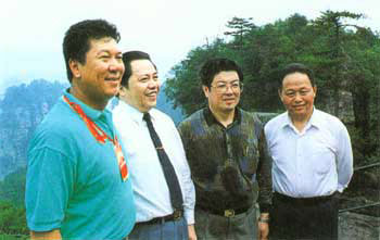 澳门特别行政区行政长官何厚铧(左一)于一九九五年五月二十七日入园考察(时任澳门大丰银行总经理、澳门赴湘考察团团长)。