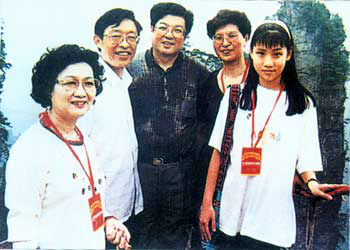 全国政协副主席王兆国(中)于一九九五年五月二十七日入园视察,香港作家协会主席朱莲芬(左一),原张家界市委书记肖征龙(左二)等陪同