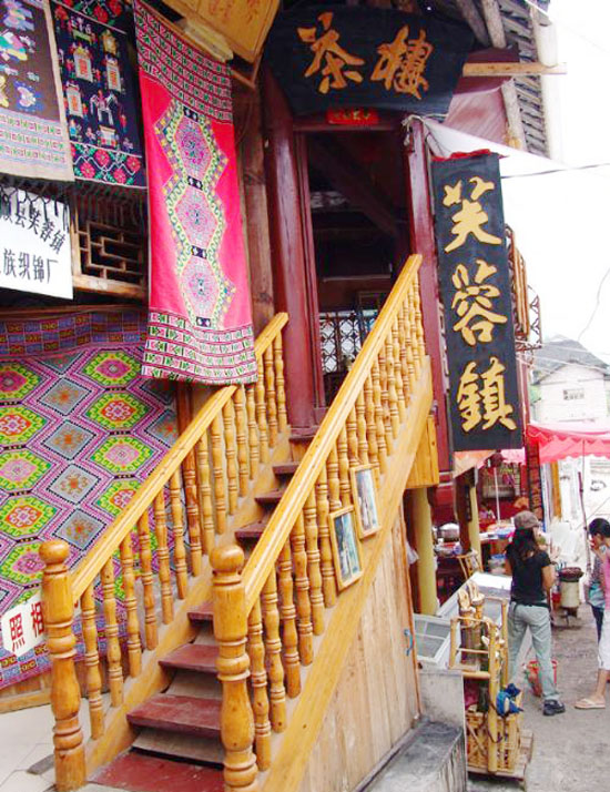 拾级而上,山路一般的陡峭。两旁的青瓦木房鳞次栉比,顺山势而错落有致。几家织锦商店已经开门,说是商店,不如叫作坊更确切些,因为店里的主要面积,都为织锦机所占领,色彩斑斓的挎包、壁挂、床上用品等都挂在墙上,游客不仅可以驻足欣赏姑娘们的手和梭子在织锦机上飞动的潇洒,还可以慢慢观赏陈列品的艺术特色。据说,当地的姑娘原来只给亲人和情郎穿针引线,如今却生产出异彩纷呈的土家织锦来卖给陌生人,从情感所系的“非卖品”到只有技巧表现的商品,这种生活方式和情感上的跨越,仿佛不过是一夜之间的事。