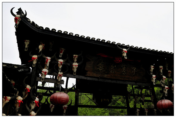 进门之后一只猛虎横卧于前,一个孩子和一只巨猿坐在旁边,这是土家族的图腾,他们自古流传信奉“以虎为父,以猿为母”。寨子里面展示的是一些土家族的繁衍历史、生活习性、使用物品等等,像土家族男女使用的不同的防身武器,有些奇形怪状的,拿给我的话还真不知道怎么用嘞。