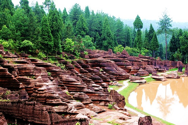 湘西红石林景区座落在古丈县境内,核心景区所辖面积约20平方公里。景区内遍布高大奇石,造型各异,颜色变化多端,且随天气、时间、季节变化而变化,晴红雨黑,阴转褐红,晨昏有别,如此奇特的“变色石”天下独一无二,世间仅有。
