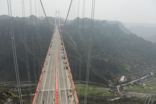 上午的10点28分,从2007年10月开始建设的矮寨大桥正式通车。矮寨特大悬索桥位于湖南省吉首市矮寨镇,地处峡谷,峡谷总体呈‘V’字型,两侧悬崖距离从900m到1300m变化,平均坡度达40度,最陡处悬崖直立,施工场地十分狭小,而且桥面与谷底垂直高差达330余米,施工难度大。矮寨特大悬索桥是长沙至重庆公路通道吉茶高速公路的控制性工程,距吉首市约20公里,在矮寨镇上空355米处跨越德夯大峡谷,主跨跨径1176米,是目前世界上跨峡谷跨径最大的钢桁梁悬索桥,创造了四个世界第一: